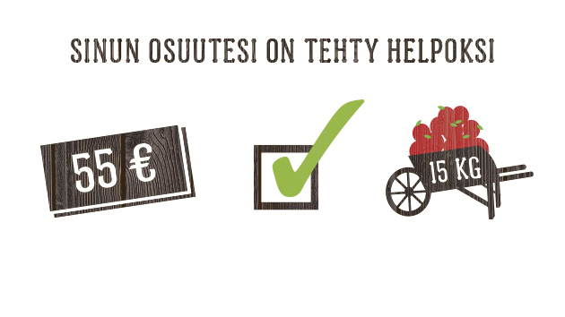Oma omenasato maksetaan ennakkoon nettikaupassa. Yksi minimiosuus eli 2 omaa omenapuuta satovuonna 2026 maksaa 55 € (sis alv. 14%) per vuosi. Tuet uudenlaista kumppanuusmaataloutta missä rahasi jäävät paikallisille pientuottajille ja edistät lähituotannon kehittymistä.